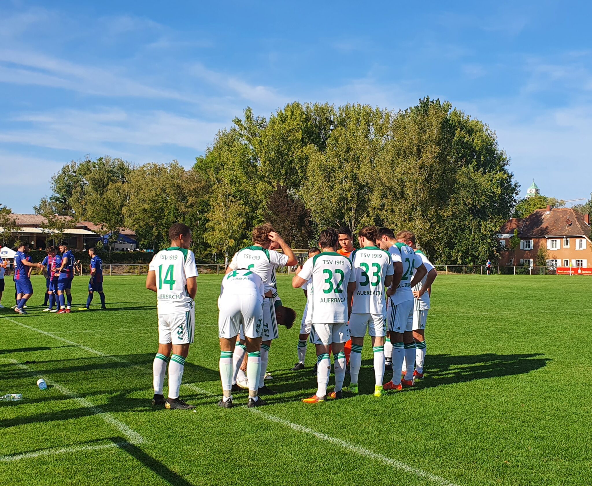 Die Halbzeitansprache des Auerbacher Trainerduos Kirchenbauer/Blank zeigte schnell Wirkung und der TSV erspielte sich zunehmend Feldvorteile. Bis diese auch in Tore umgemünzt wurden, scheiterte Manuel Balzer nach schöner Vorarbeit von Pfeiffer und Rapp mutterseelenallein im Fünfmeterraum mit einem Kopfballversuch, der am Kasten vorbeiflog (56.). Drei Minuten später machte er es allerdings besser und verwertete einen Eckball von Pfeiffer aus dem Gewühl heraus zum 1:0 für den TSV. Die Führung brachte nicht die gewünschte Sicherheit und so konnte die TSV-Elf sich zunächst bei Kapitän Denzel bedanken, der nach einem schnell ausgespielten Angriff der SG zur Ecke rettete (64.). In der 75. Minute besorgte Paluschka dann mit einem satten Schuss ins lange Eck den Ausgleich. In der Folge packte Kahn binnen weniger Sekunden gleich zwei Wahnsinnsparaden gegen den eingewechselten Bakayoko aus, mit denen er die Grünweißen im Spiel hielt. Fünf Minuten vor dem Ende war sein Gegenüber Kühner dann Ausgangspunkt für den Auerbacher Siegtreffer: Ein weiter Ball, den Denzel abfing und Pfeiffer in den Lauf legte. Dieser aus 35 Metern mit dem Auge für den noch weit vor dem Tor postierten Kühner und dem Schuss ins Glück – 1:2! In der Nachspielzeit sah Gavrilovic aufgrund eines Fouls am eingewechselten Moser dann noch die Ampelkarte. Kurz vor dem Schlusspfiff hätte Moser fast noch das 1:3 besorgt, traf allerdings leider nur die Latte. Das änderte aber nichts mehr daran, dass der TSV trotz einiger Unzulänglichkeiten im Spiel den Sieg perfekt machte und sich so nach der unglücklichen Niederlage vergangene Woche über die ersten drei Punkte auf dem Konto freuen darf.