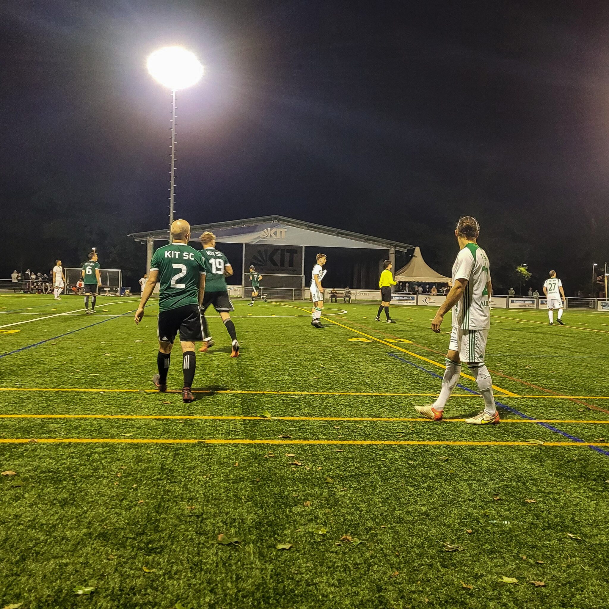 Obwohl der TSV im Nachholspiel beim KIT SC vor allem spielerisch nicht wirklich an die Leistung von vergangenem Sonntag anknüpfen konnte, reichten die mannschaftliche Geschlossenheit und der unbedingte Siegeswille für den ersten Auswärtsdreier der laufenden Runde. Anfänglich lief es jedoch erstmal für die Gastgeber rund, die nach einem Einwurf und einer Flanke von der linken Seite durch den sträflich allein gelassenen Phil Weimer in Führung gehen konnten (6.). Davon gänzlich unbeeindruckt belohnte sich die Elf um Kapitän Pascal Pfeiffer nur wenige Minuten später mit dem Ausgleich. Das hohe Anlaufen brachte Erfolg, Pfeiffer legte den gewonnenen Ball nochmal auf Guthmann ab, der sich diesen zurechtlegte und kompromisslos zum 1:1 vollendete (10.). Pitz verfehlte das Gehäuse per Kopf nach präziser Hauser-Flanke um ein gutes Stück (18.), bevor sich Rapp nach einem Eckball auf der Gegenseite das erste Mal beweisen musste und der Nachschuss am Winkel vorbeiflog (23.). In der Folge verflachte die Partie zusehends. Die heimischen Frösche hatten mehr Spielanteile, brachten das TSV-Tor aber nicht in nennenswerte Gefahr, während es dem Auerbacher Offensivspiel an zündenden Ideen fehlte. Längere Ballbesitzphasen suchte man vergebens und die vielen langen Bälle waren an diesem Tag nicht das ersehnte Erfolgsrezept. Die letzten Minuten vor der Halbzeit sollten dann aber nochmal für ein wenig Spektakel sorgen. Erismann setzte mit einem Traumzuspiel Balzer in Szene, der sich im Strafraum stark behauptete und zum 1:2 anschrieb (39.). Kurz darauf lenkte Rapp einen Distanzschuss der Studis gerade noch um den Pfosten, womit die knappe Auerbacher Führung zur Pause Bestand hatte.