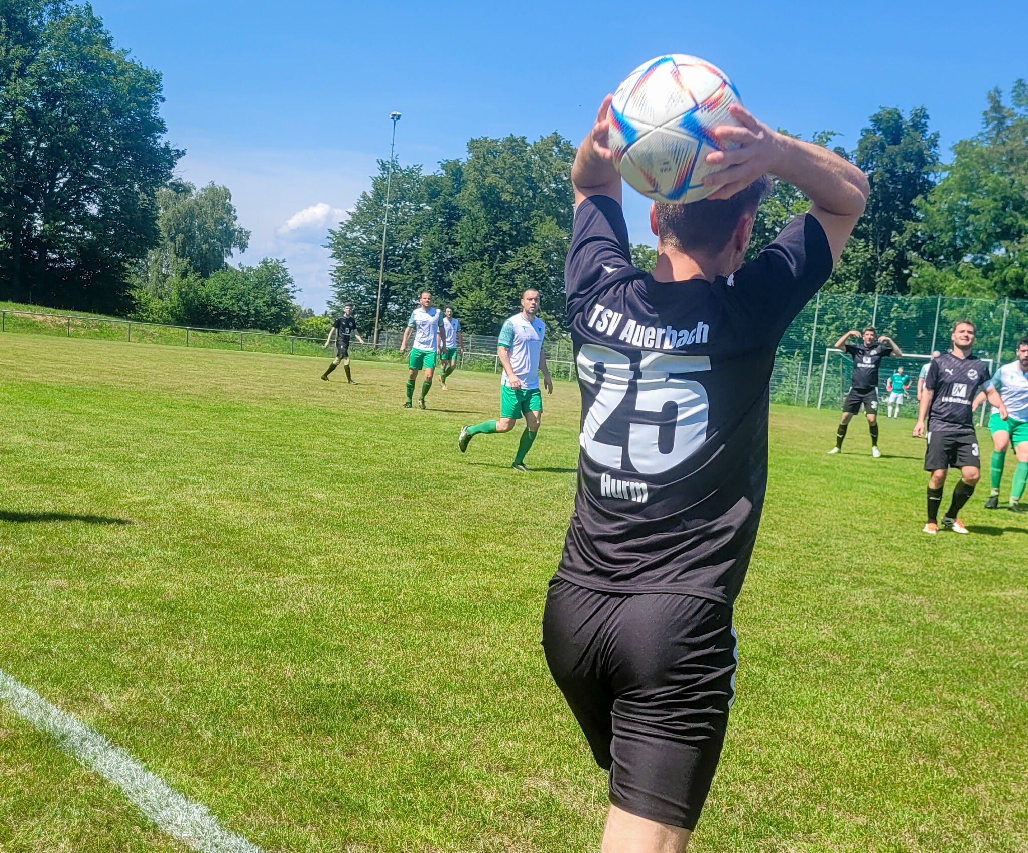 Mit gerade einmal elf Spielern und ohne etatmäßigen Torhüter reiste unsere Zweite am Samstagmittag zum Tabellenletzten nach Schöllbronn. Coach David Bossert sah sich gezwungen, selbst die Handschuhe überzustreifen und in den Kasten zu stehen. Trotz dieser personellen Notlage zeigte das Team Moral und nahm bei hochsommerlichen Temperaturen nach einem turbulenten Spielverlauf einen verdienten Punkt mit nach Hause. Schon in der Anfangsphase hätte es schnell 1:1 stehen können: Max Wenz stand bei der ersten Auerbacher Großchance angeblich im Abseits, im Gegenzug rettete Bossert stark zur Ecke. Kurz darauf musste Klittich auf der Linie für den bereits geschlagenen Keeper klären (13.). Eine Minute später glänzte Bossert erneut mit einer starken Fußabwehr nach einer Freistoßvariante der Gastgeber. Nach der dringend benötigten Trinkpause nutzte Schöllbronn die nächste Chance zum 1:0 (26.). Der TSV ließ sich davon jedoch nicht beeindrucken und kam kurz vor der Pause durch einen sehenswerten Spielzug zum Ausgleich: Max Wenz vollendete in der 43. Minute zum 1:1.