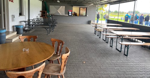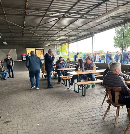 Unter dem großzügig angelegten Vordach befinden sich genügend Sitzgelegenheiten für Zuschauer, Spieler und Vereinsmitglieder. An der Stirnseite befindet sich die Getränkeausgabe. Ich muss noch etwas warten, bis sich die Spieler beginnen aufzuwärmen und letztendlich die Wurstkurve kurz danach öffnet. Noch bevor ich mir meine Apfelschorle gönne, sehe ich zwei meiner Auerbacher Vorstände, wie sie die Offiziellen der Spöcker freundschaftlich begrüßen und sich dann zu mir setzen. Es dauert nicht lange, da kommt auch der erste Spöcker-Anhänger bei uns am Tisch vorbei und hält ein bisschen Smalltalk mit uns. Nachdem nun die Formalitäten erledigt sind, geht es dann ab in Richtung Getränkeausgabe, mal schauen was es gibt. Nach der Öffnung gibt es direkt einen größeren Andrang, jeder will ja schließlich sein Bier. Das zweite Bild, in der Halbzeit aufgenommen, zeigt, dass die Plätze gerne von den Zuschauern angenommen werden.