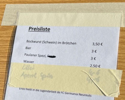 Erwartungsgemäß hat die Wurstkurve noch nicht geöffnet. Mich begrüßen gleich 4 Wurstkeeper und bieten mir bereits das erste Bier an. Ein Blick auf die Karte lässt mich zunächst etwas zucken, der Lillet und Aperol Spritz sind abgeklebt. Offensichtlich hat dies einer der Wurstkeeper erkannt und sagt mir sofort, dass ich beides im angrenzenden Clubhaus bekomme und die Würstchen sich noch nicht im Topf befinden. Also gibt’s erstmal ein Paulaner Spezi.